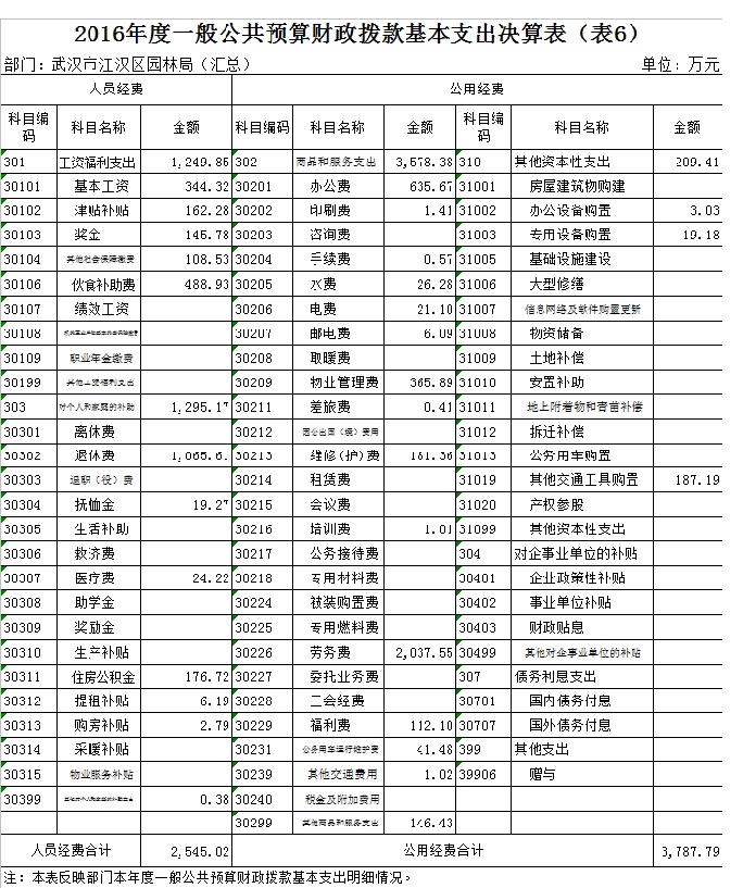 二、部门单位构成 从决算单位构成来看,武汉市江汉区园林局部门决算由纳入独立核算的单位本级决算和7个下属单位决算组成。其中:行政单位1个、差额拨款事业单位7个。 纳入武汉市江汉区园林局2016年度部门决算编制范围的二级预算单位包括: 1.武汉市江汉区园林局机关 2.武汉市江汉区园林局绿化队 3.武汉市小南湖公园 4.武汉市江汉区园林局江汉苗圃 5.江汉区西北湖绿化广场管理处 6.武汉市江汉区园林局常青公园 7.武汉市江汉区菱角湖公园 8.武汉市江汉公园 三、部门人员构成 武汉市江汉区园林局总编制人数251人,其中:行政编制14人,事业编制237人。在职实有人数153人,其中:行政11人,事业142人。 离退休人员136人,其中:退休136人。 第二部分、武汉市江汉区园林局2016年度部门决算情况说明 一、2016年度收入支出决算总体情况 2016年度收入总计6272.85万元,支出总计6332.81万元。与2015年相比,收入减少84.15万元,降低1.32 %,主要原因是2016年住房保障支出减少13.25万元,城乡社区支出减少10.94万元。支出减少24.19万元,增长降低0.38%,主要原因是2016年住房保障支出减少13.25万元,城乡社区支出减少10.94万元。 二、2016年度收入决算情况 2016年度本年收入合计6272.85万元。其中:财政拨款收入(含政府性基金拨款)6272.85万元,占本年收入100%. 三、2016年度支出决算情况 2016年度本年支出合计6332.81万元。其中:基本支出6332.81万元. 四、2016年度财政拨款收入支出决算总体情况 2016年度收入总计6272.85万元,支出总计6332.81万元。与2015年相比,收入减少84.15万元,降低1.32 %,主要原因是2016年住房保障支出减少13.25万元,城乡社区支出减少。支出减少24.19万元,降低0.38%,主要原因是2016年住房保障支出减少13.25万元,城乡社区支出减少。 五、2016年度一般公共预算财政拨款支出决算情况 2016年一般公共预算财政拨款支出年度预算为6332.81万元(包括年初部门预算、基本建设等专项资金、上级下达的专项转移支付资金及年初结转和结余资金等支出),支出决算为6332.81万元,完成年度预算的100%。其中:基本支出6332.81万元. (一)社会保障和就业支出(类)。年度预算为536.17万元,支出决算为536.17万元,完成年度预算的100%。 (三)城乡社区支出(类)。年度预算为5744.31万元,支出决算为5745.65万元,完成年度预算的100%。 (四)住房保障支出(类)。年度预算为28.84万元,支出决算为28.84万元,完成年度预算的100%。 六、2016年度一般公共预算财政拨款基本支出决算情况 2016年度一般公共预算财政拨款基本支出6332.81万元,其中,人员经费2545.02万元,主要包括:基本工资、津贴补贴、奖金、社会保障缴费、绩效工资、其他工资福利支出、离休费、退休费、抚恤金、退职(役)费、抚恤金、生活补助、救济费、医疗费、助学金、奖励金、生产补贴、住房公积金、提租补贴、购房补贴、其他对个人和家庭的补助支出;商品和服务支出3578.38万元,主要包括:办公费、印刷费、咨询费、手续费、水费、电费、邮电费、取暖费、物业管理费、差旅费、因公出国(境)费、维修(护)费、租赁费、会议费、培训费、公务接待费、专用材料费、被装购置费、专用燃料费、劳务费、委托业务费、工会经费、福利费、公务用车运行维护费、其他交通费用、税金及附加费用、其他商品和服务支出;其他资本性支出209.41万元,主要包括:办公设备购置、专用设备购置、信息网络及软件购置更新、物资储备、公务用车购置、其他交通工具购置、其他资本性支出。 七、2016年度一般公共预算财政拨款“三公”经费支出决算情况 (一)“三公”经费的单位范围 武汉市江汉区园林局有一般公共预算财政拨款预算安排“三公”经费的单位包括武汉市江汉区园林局本级及下属7个差额拨款事业单位。 (二)一般公共预算财政拨款"三公"经费支出决算情况 武汉市江汉区园林局2016年度公务用车购置及运行维护费支出决算为41.48万元(均为作业、工具车运行维护费)。 八、2016年度政府性基金预算财政拨款收入支出决算情况 武汉市江汉区园林局2016年无政府性基金预算财政拨款。 九、2016年度其他重要事项的情况 (一)机关运行经费支出情况。2016年度武汉市江汉区园林局机关运行经费支出3150万元,较2015年(同口径)减少384万元,降低10.86%。主要原因是城乡社区事务减少384万元. (二)政府采购支出情况。2016年度武汉市江汉区园林局机关政府采购支出总额112.26万元。 (三)国有资产占用情况。截至2016年12月31日,武汉市江汉区园林局无公务用车。