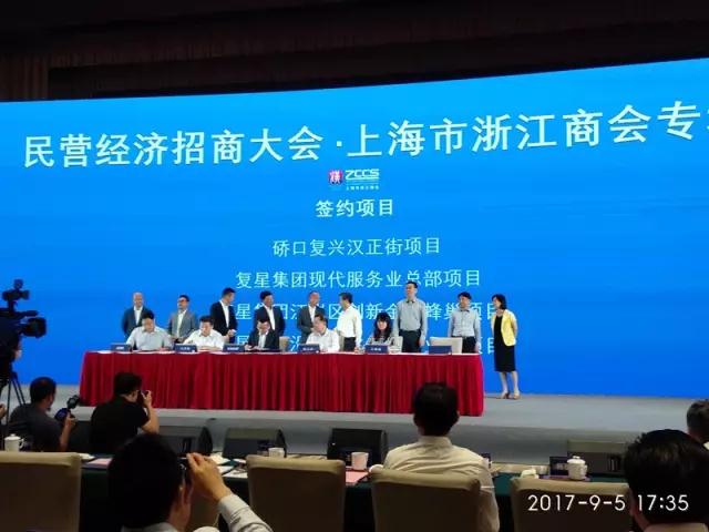 9月5日,我市举办民营经济招商大会,首场活动迎来60多位上海市浙江商会企业家。会上,省委副书记、市委书记陈一新现场做主题演讲,诚挚邀请广大浙江商业企业家来汉投资兴业。现场共签约11个项目,累计签约金额达1292亿元。其中,由我区组织的复星集团“健康金融文化蜂巢项目”和通策医疗华中区域总部项目参加签约仪式,签约金额达330亿元。