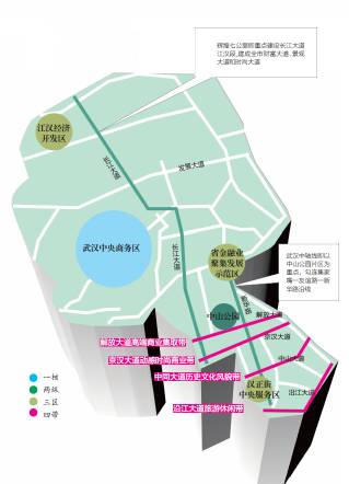 “四带”:即解放大道高端商业集聚带、中山大道历史文化风貌带、沿江大道旅游休闲带、京汉大道动感时尚商业带,增强四大产业带功能,以此再造中心之城、重塑复兴之路。