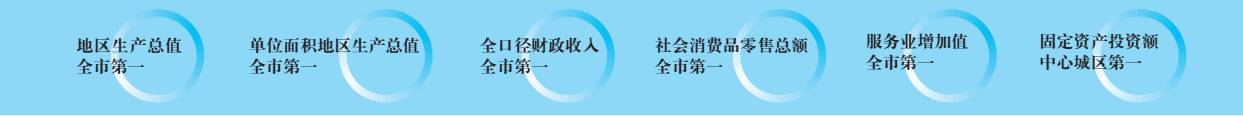 2016年地区生产总值在全市中心城区率先突破千亿元大关,达到1034亿元,居全市第一;全口径财政收入211亿元,全市第一;社会消费品零售总额977亿元,全市第一;服务业增加值952.67亿元,全市第一。