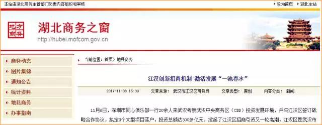 11月6日,深圳市同心俱乐部一行20余人来武汉考察武汉中央商务区(CBD)投资发展环境,并与江汉区签订战略合作协议,拟定3个大型项目落户,投资总额达300多亿元,掀起了江汉区招商引资又一轮高潮。