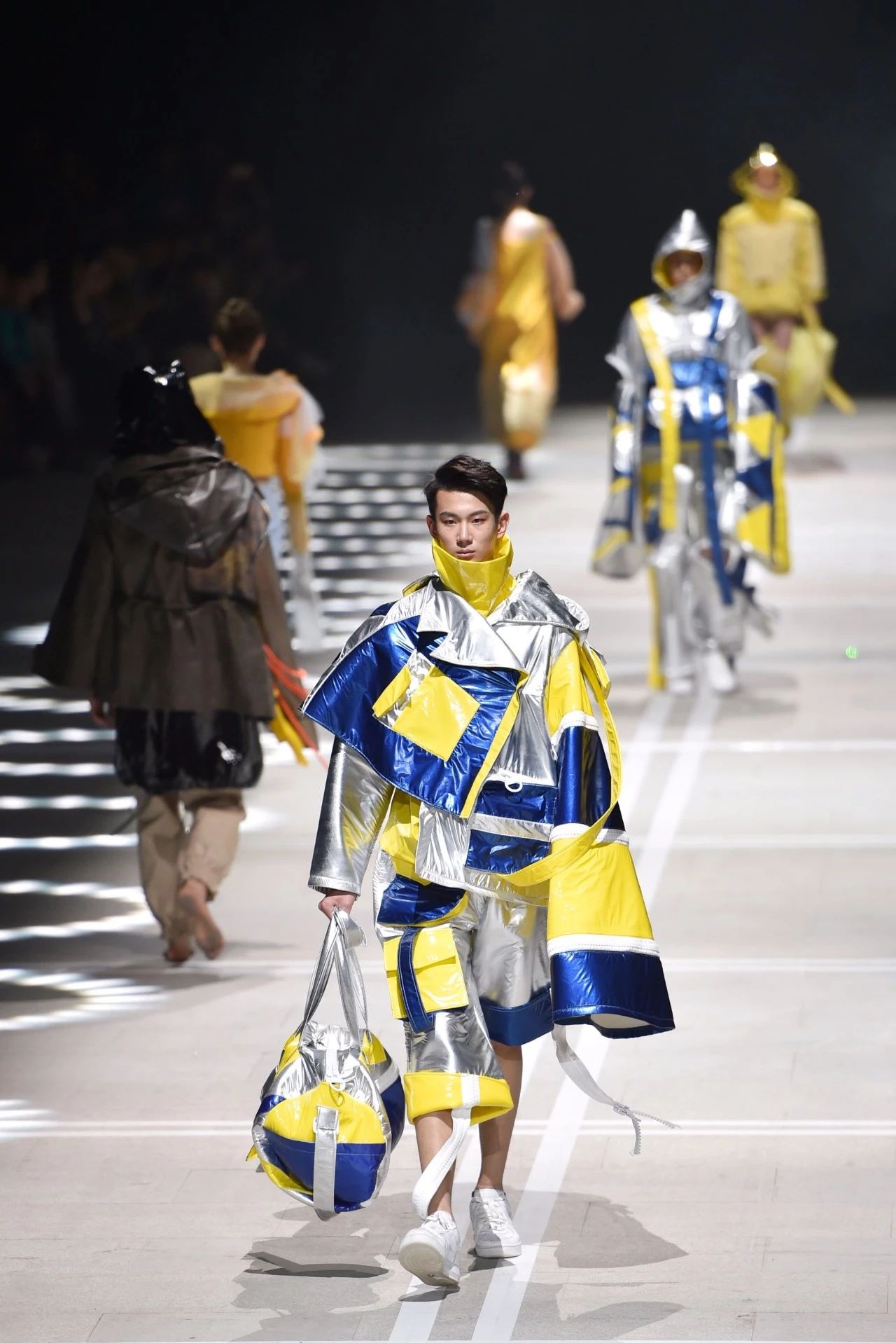 湖北美术学院服装艺术设计系带来的开场秀,以“上街”为主题,展现武汉不同市井生活场面与霓虹灯下的现代街景;江汉大学“穿·越”动态秀,经历了前后半年构思、设计、制作,是服装设计专业教学成果的一次现场展示;设计师胡社光,带着不久前刚刚亮相中国国际时装周的“时尚娘子军”,带来一场“面料融合大秀”……“设计新锐”成梦幻舞台名副其实的“主角”。