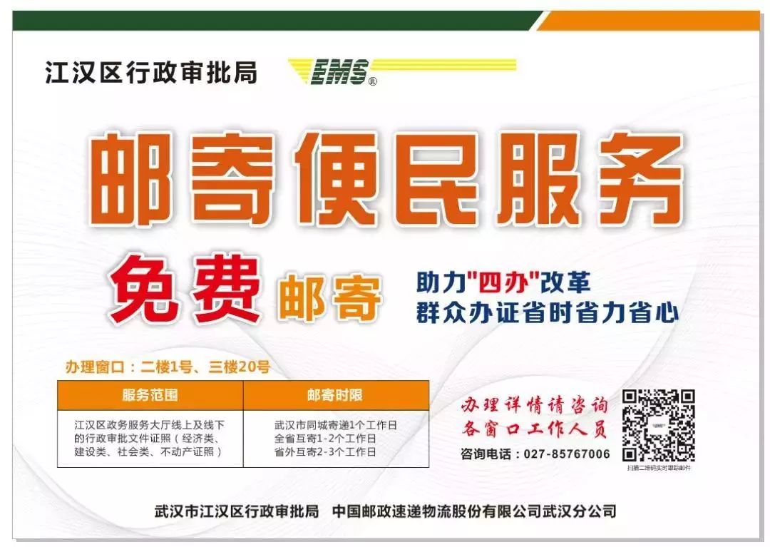 以企业登记业务为例,江汉行政审批局将“网上申报、网上受理、网上审核”的全程电子化登记的服务末端延伸,企业只需勾选“邮寄”选项,审核通过后,证照将直接邮寄到家。“上门取”变为“免费寄”让制度性成本得到大幅降低,企业有更多时间精力投入生产运营。上线第一天,已为67位群众提供免费邮寄服务。