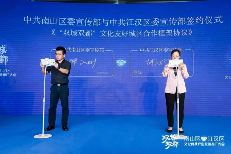 双城双都,产业共融。20日,由中共武汉市江汉区委宣传部与中共深圳南山区委宣传部共同主办的“双城双都·江汉区-南山区文化科技产业交流推广大会”,在深圳文博会分会场海上世界文化艺术中心举行。
