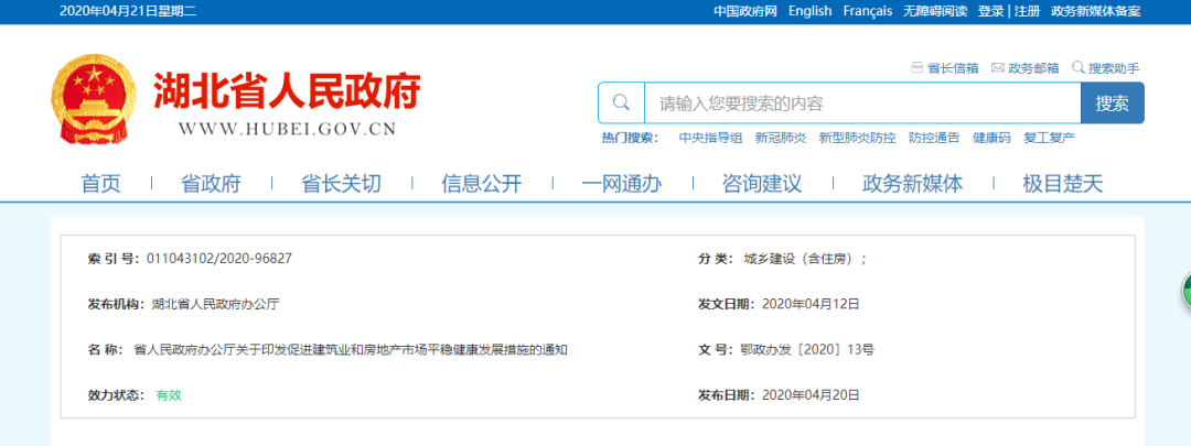 4月20日,湖北省人民政府办公厅印发《促进建筑业和房地产市场平稳健康发展措施的通知》,《通知》共计28条措施,促进建筑业和房地产市场平稳健康发展。