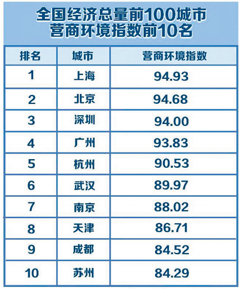 万博新经济研究院联合中国战略文化促进会、中国连锁经营协会、中国经济传媒协会、第一财经研究院发布,根据2020中国城市营商环境的评价结果,营商环境指数排名前十的城市分别为:上海、北京、深圳、广州、杭州、武汉、南京、天津、成都、苏州。