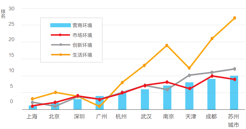 《报告》认为,市场环境、法治环境对经济发展助力最大,创新环境次之。针对企业关注度高的市场环境、监管执法和法治保障环境,出台有针对性的政策,更有助于企业走出困境,提升其政策获得感。武汉在这方面表现抢眼,市场环境指数位列第七,创新环境指数位列第六。