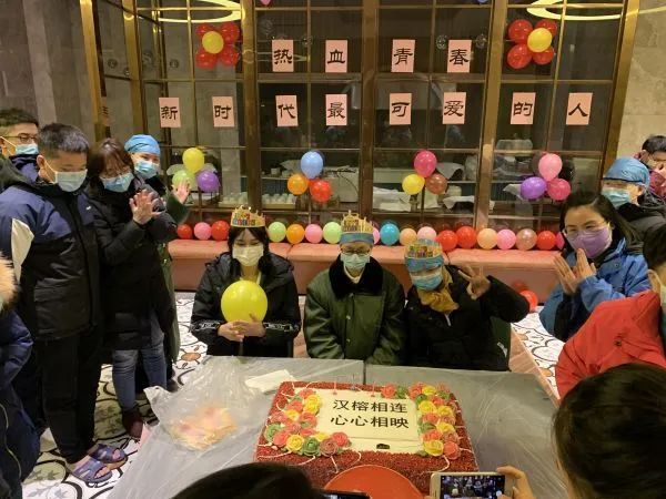 得知2月20日是福建省立医院3名医疗队队员的生日,这是第一次为队员过生日,郭国松和队员们动员所有人全城寻找能定制蛋糕的地方,终于联系到皇冠幸福里的蛋糕工厂,赶制了一个写着“汉榕相连,心心相映”的生日蛋糕,美女保障队队员给寿星写了暖心的生日贺卡。因为疫情不能聚集,医疗队队员们就在酒店大堂用1分钟简单庆祝了一下这个“特殊的生日”。而为了准备这场生日,突击队队员们、酒店足足忙活了一天一夜。