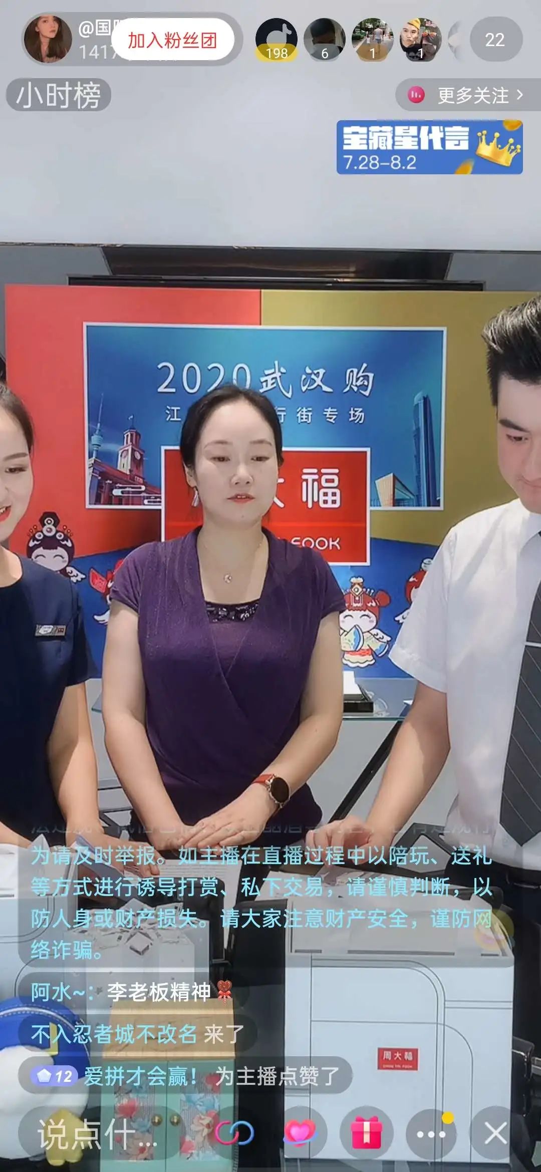 市商务局局长韩民春、区政府常务副区长张劲、区政府副区长张智勇、区政府副区长赫敏,区政府党组成员、中央商务区专职副主任王瑞,区政府党组成员曹建等参与直播带货,江汉路步行街精益眼镜、大洋百货、锐力体育、周大福、合内合外·集市、 汉字造梦、叶开泰等一批企业参与活动。