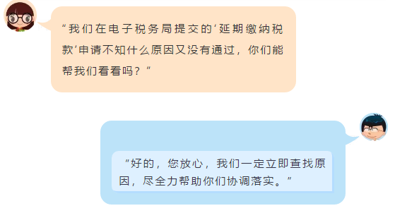 通过“点对点”核实数据,税务干部及时分析并发现了企业申请未通过的原因,辅导企业,更改办理路径,用最快的时间和方法,帮助企业办理了1、2、3月份的“延期申报”,让企业得以缓缴增值税及附加税26.5万元,解决了纳税人的燃眉之急。