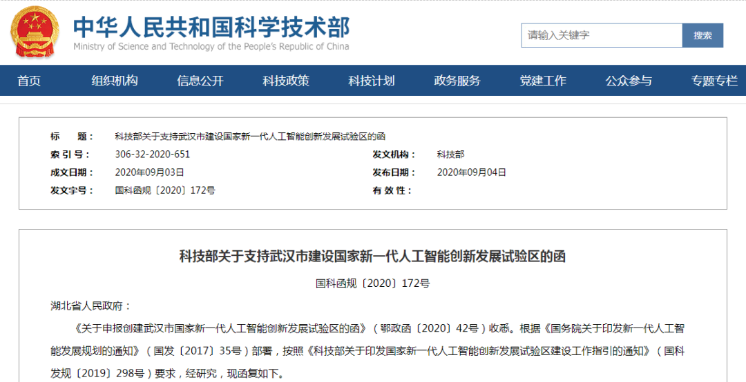 9月4日,国家科技部正式发文批复《武汉市建设国家新一代人工智能创新发展试验区方案》,支持武汉市建设国家新一代人工智能创新发展试验区。