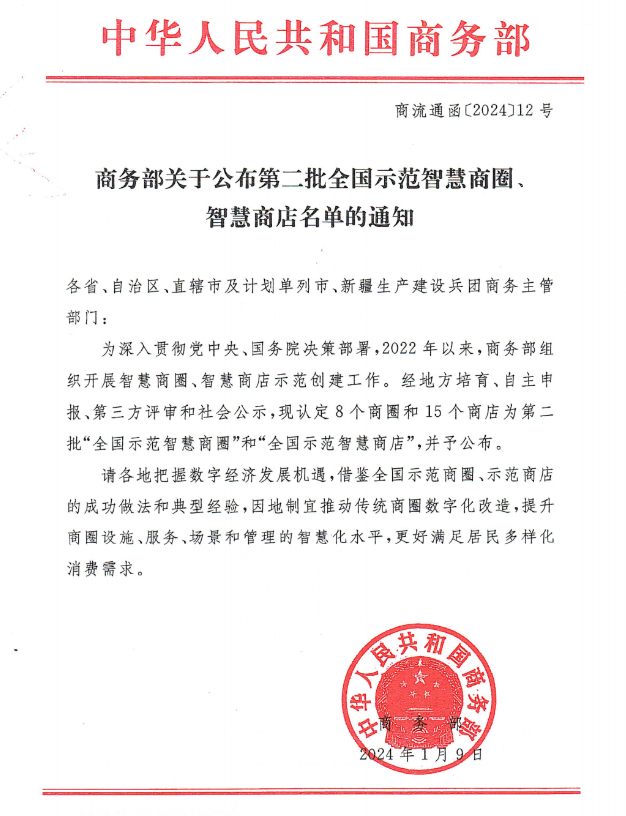 1月15日,商务部网站发布关于公布第二批全国示范智慧商圈、智慧商店名单的通知,认定8个商圈、15个商店为第二批“全国示范智慧商圈”“全国示范智慧商店”。