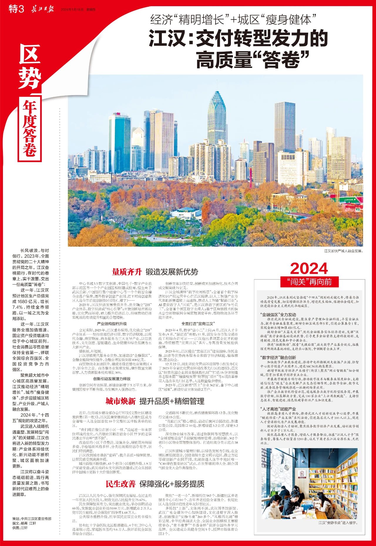 2024年,江汉来到攻坚推进“十四五”规划的关键之年,将着力推动高质量发展,切实增强经济活力,增进民生福祉,保持社会稳定,加快建设社会主义现代化卓越城区。