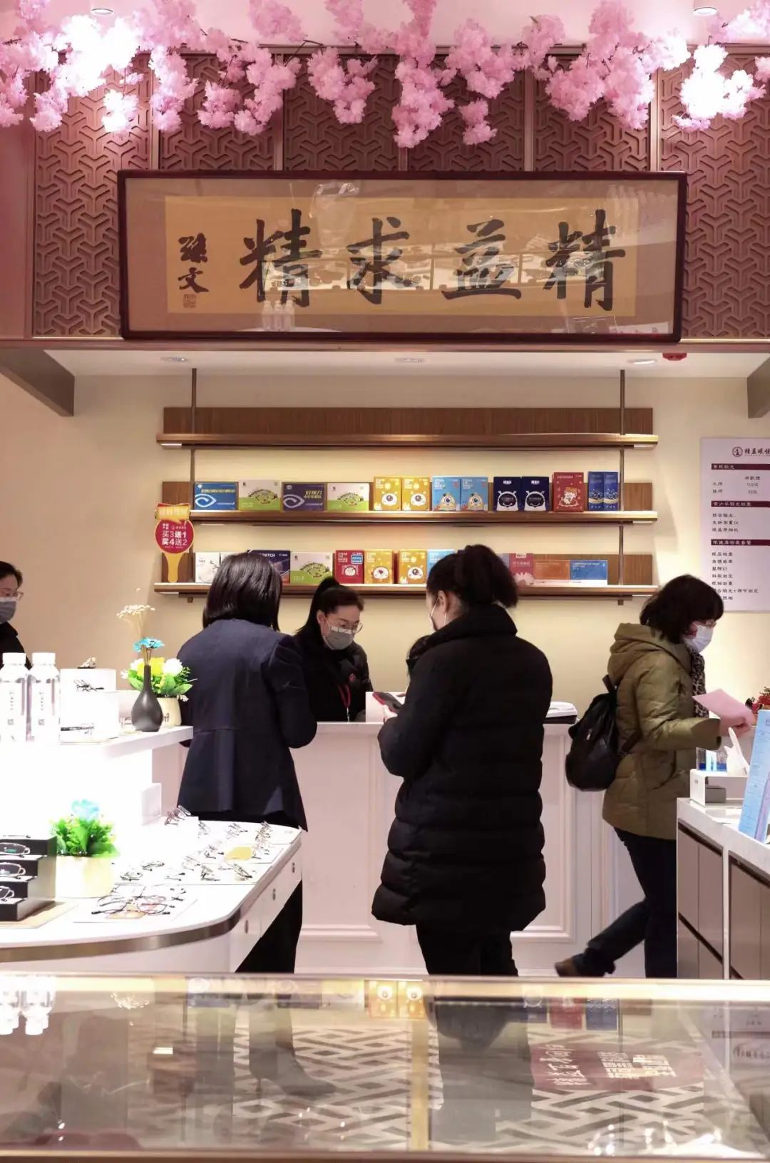 走进精益眼镜新总店,精致的海派装潢,四处点缀的樱花装饰,两座IP形象“桐小爷”玩偶,无不彰显着这个老字号的新面貌。而最显眼处,依然挂着孙中山题写的“精益求精”四个字。