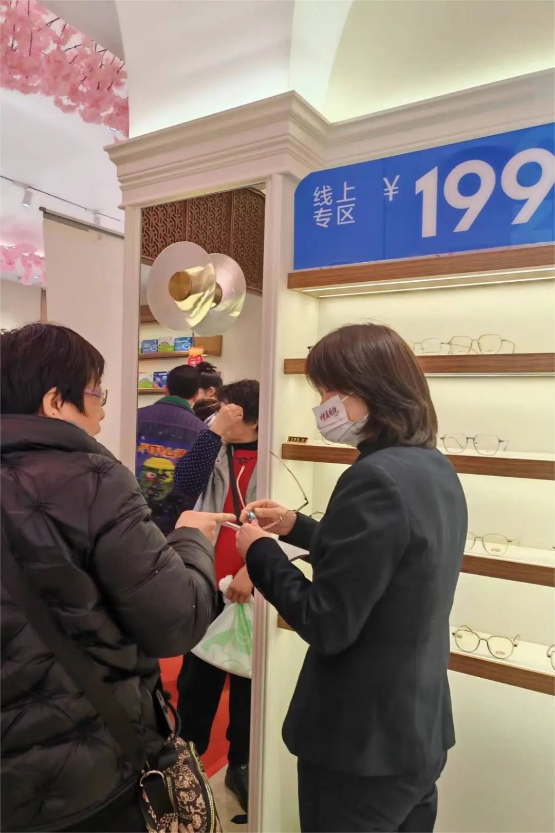 为了适应市场需求,吸引年轻消费群体,2022年起,精益眼镜入驻抖音、美团等团购平台,推出不同档次的配镜套餐,包含镜架、镜片及全套验光服务,价格在199-899元不等。在抖音团购平台可以看到,最平价的199元套餐月销量已超过500单。新开业的总店也专门设有“线上专区”,产品按价位陈列,一目了然,吸引不少顾客试戴。