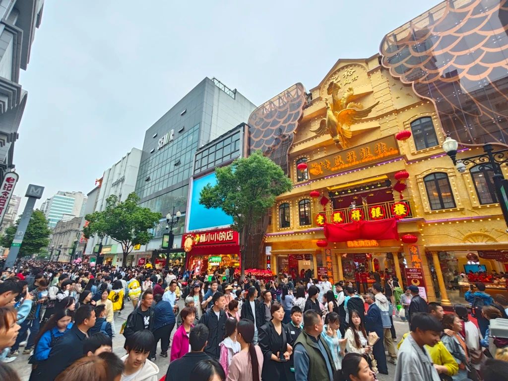 五一假期首日,江汉路上人潮涌动。见习记者陈星雨 摄