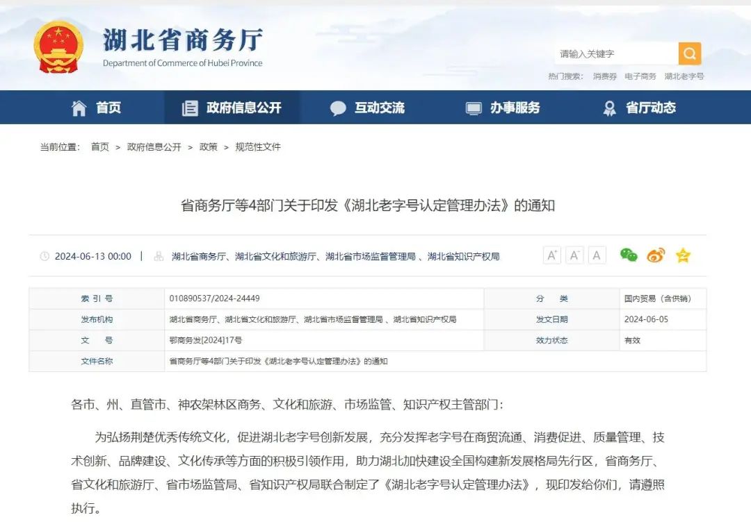 近日,省商务厅官网发布《湖北老字号标识和牌匾使用规定》(简称《规定》),对湖北老字号标识的标准图形、标准字体、标准色彩、标准组合进行了统一规定,湖北老字号标识由标准图形和“湖北老字号”中英文文字组成,图形可单独使用,也可与文字组合使用。