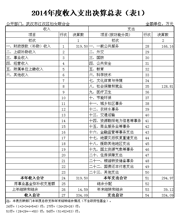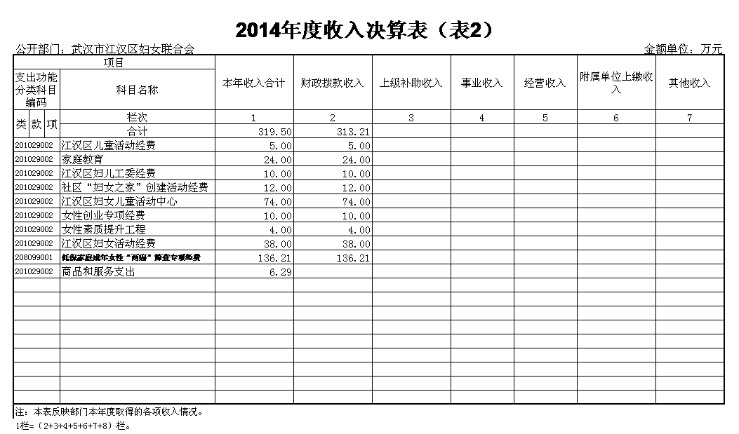 武汉市江汉区妇女联合会2014年度本年收入合计319.5万元。其中:财政拨款收入319.5万元。