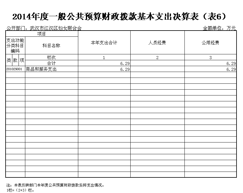 武汉市江汉区妇女联合会2014度一般公共预算财政拨款基本支出6.29万元,其中,公用经费6.29万元,主要包括:办公费、印刷费、公务用车运行维护费、其他交通费用、其他商品和服务支出。