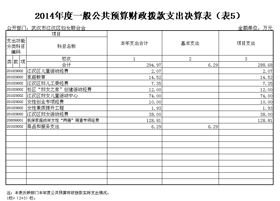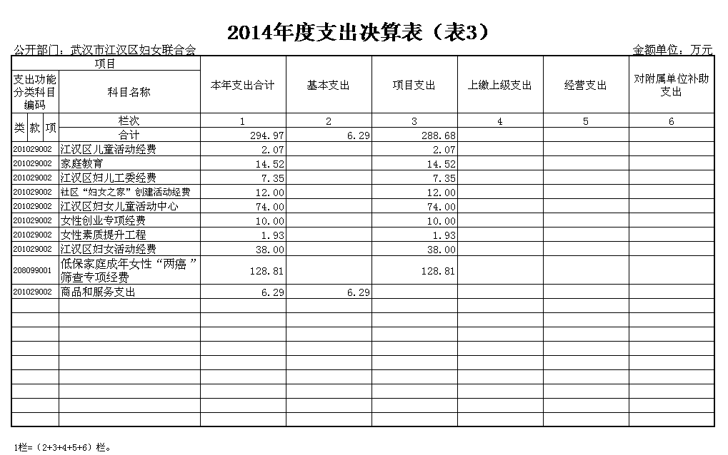 武汉市江汉区妇女联合会2014年度本年支出合计294.97万元。其中:基本支出6.29万元,项目支出288.68万元。