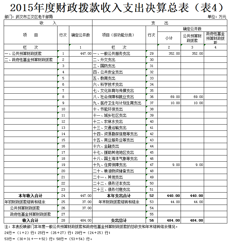 2015年度收入总计484万元,支出总计440万元。与2014年相比,收入增加134万元,主要原因是职工工资增加和老干工作经费提高。支出增加113万元,主要原因是职工工资增加和老干工作经费提高。