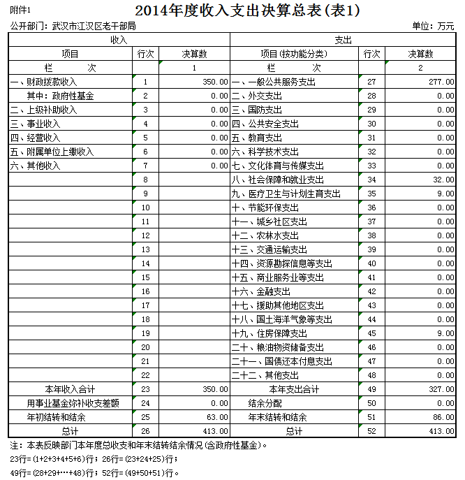 武汉市江汉区老干部局2014年度收入总计350万元,支出总计327万元。与2013年相比,收入增减0%,主要原因是 。支出增减0%。主要原因是 。