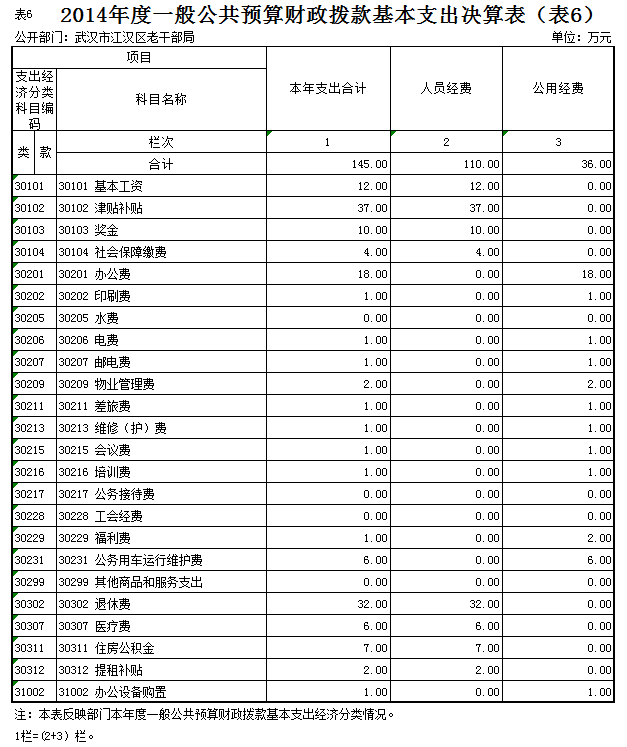 武汉市江汉区老干部局2014度一般公共预算财政拨款基本支出146万元,其中,人员经费110万元,主要包括:基本工资、津贴补贴、奖金、社会保障缴费、伙食补助费、绩效工资、其他工资福利支出、离休费、退休费、抚恤金、退职(役)费、抚恤金、生活补助、医疗费、助学金、资励金、住房公积金、提租补贴、购房补贴、其他对个人和家庭的补助支出;公用经费36万元,主要包括:办公费、印刷费、咨询费、手续费、水费、电费、邮电费、取暖费、物业管理费、差旅费、因公出国(境)费、专用维修(护)费、租赁费、会议费、培训费、公务接待费、专用材料费、被装购置费、专用燃料费、劳务费、委托业务费、工会经费、福利费、公务用车运行维护费、其他交通费用、税金及附加费用、其他商品和服务支出、办公设备购置、专用设备购置、信息网络及软件购置更新、其他资本性支出。