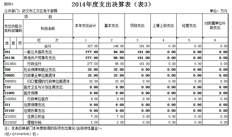 武汉市江汉区老干部局2014年度本年支出合计327万元。其中:基本支出146万元,占本年支出44.65 %,项目支出181万元,占本年支出55.35 %,上缴上级支出0万元,占本年支出0 %,经营支出 0万元,占本年支出0%,对附属单位补助支出0万元,占本年支出0%。