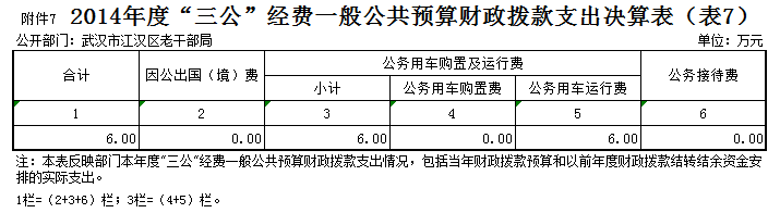 (一)因公出国(境)费用支出决算为0万元。 (二)公务用车购置及运行维护费支出决算为6万元。