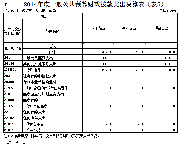 武汉市江汉区老干部局2014年一般公共预算财政拨款支出年度预算为350万元(包括年初部门预算、基本建设等专项资金、上级下达的专项转移支付资金及年初结转和结余资金等支出),支出决算为327万元,完成年度预算的93.43%。其中:基本支出146万元,项目支出181万元。