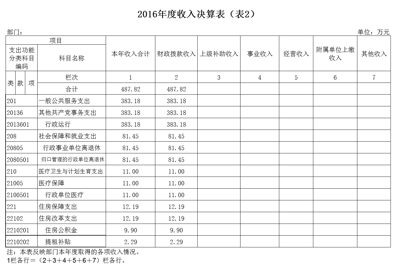 2016年度本年收入合计 487.82 万元。其中:财政拨款收入(含政府性基金拨款) 487.82 万元,占本年收入 100 %,上级补助收入 0 万元,占本年收入 0 %,事业收入 0 万元,占本年收入 0 %,经营收入 0 万元,占本年收入 0 %,附属单位上缴收入 0 万元,占本年收入 0 %,其他收入 0 万元,占本年收入 0 %。