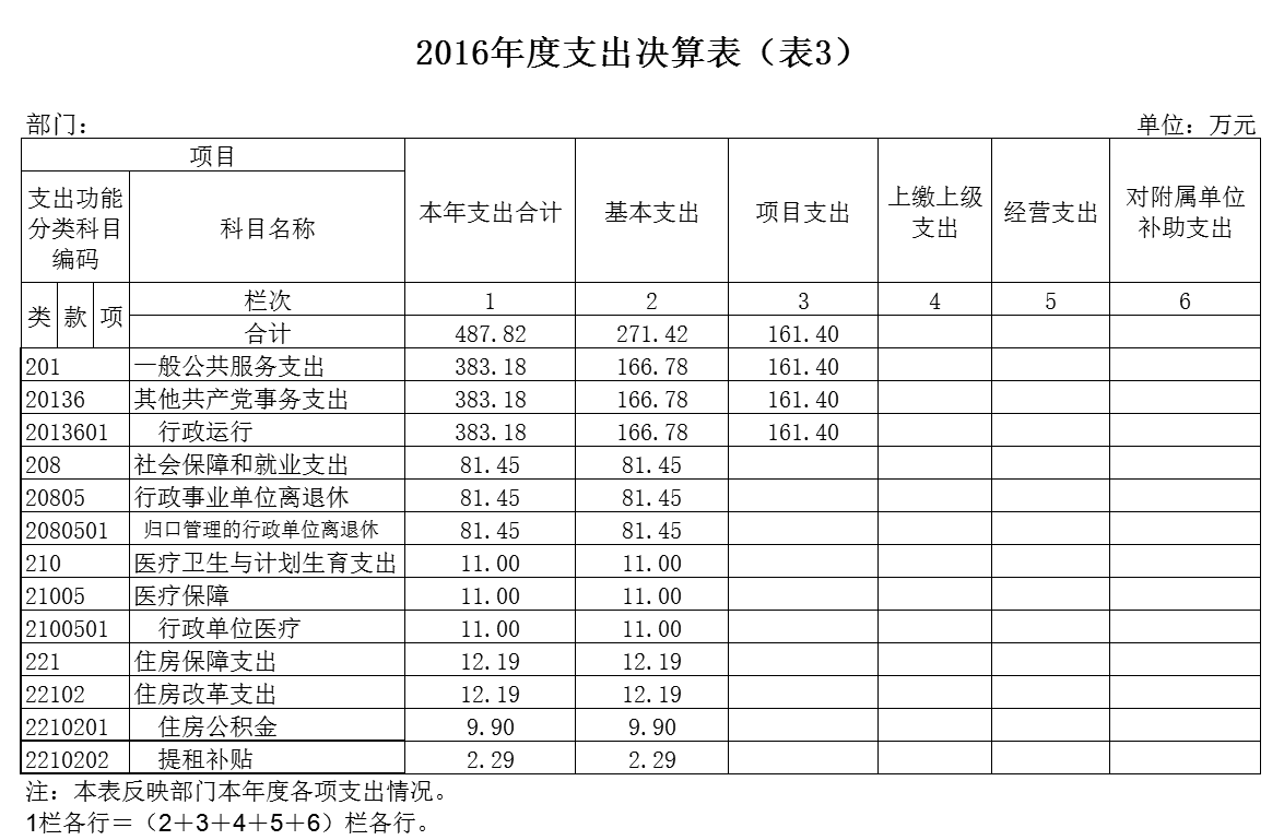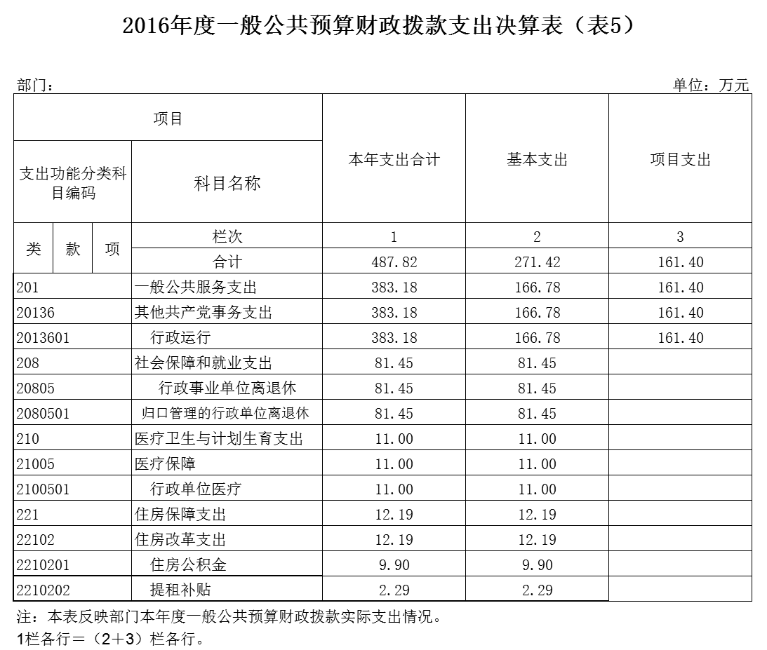 2016年一般公共预算财政拨款支出年度预算为 388 万元(包括年初部门预算、基本建设等专项资金、上级下达的专项转移支付资金及年初结转和结余资金等支出),支出决算为 487.82万元,完成年度预算的 125 %。其中:基本支出 269.42 万元,项目支出 163.41 万元。项目支出主要用于行政事业类项目163.41 万元,主要成效保障落实好老干部相关经费。