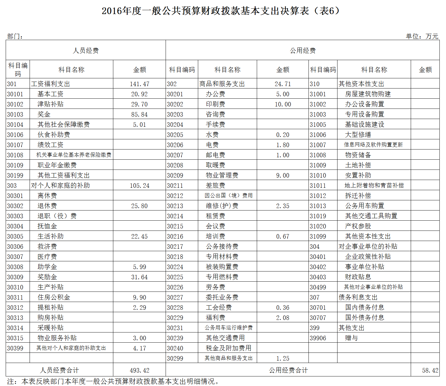 2016年度一般公共预算财政拨款基本支出 269.42 万元,其中,人员经费 244.71 万元,主要包括:基本工资、津贴补贴、奖金、社会保障缴费、绩效工资、其他工资福利支出、离休费、退休费、抚恤金、退职(役)费、抚恤金、生活补助、救济费、医疗费、助学金、奖励金、生产补贴、住房公积金、提租补贴、购房补贴、其他对个人和家庭的补助支出;公用经费 24.71 万元,主要包括:办公费、印刷费、咨询费、手续费、水费、电费、邮电费、取暖费、物业管理费、差旅费、因公出国(境)费、维修(护)费、租赁费、会议费、培训费、公务接待费、专用材料费、被装购置费、专用燃料费、劳务费、委托业务费、工会经费、福利费、公务用车运行维护费、其他交通费用、税金及附加费用、其他商品和服务支出;其他资本性支出 0 万元,主要包括:房屋建筑构建费、办公设备购置、专用设备购置、基础设施建设、大型修缮、信息网络及软件购置更新、物资储备、土地补偿、安置补助、地上附着物和青苗补助、拆迁补偿、公务用车购置、其他交通工具购置、其他基本建设和资本性支出;对企事业单位的补贴 0 万元,主要包括:企业政策性补贴、事业单位补贴、财政贴息、其他对企事业单位的补贴;债务利息和其他支出 0 万元,主要包括:国内债务付息、国外债务付息、赠与。