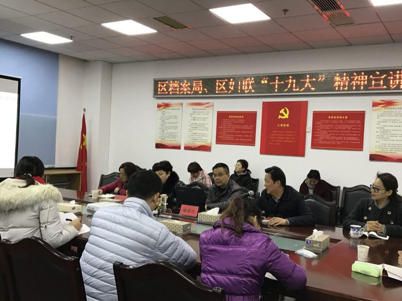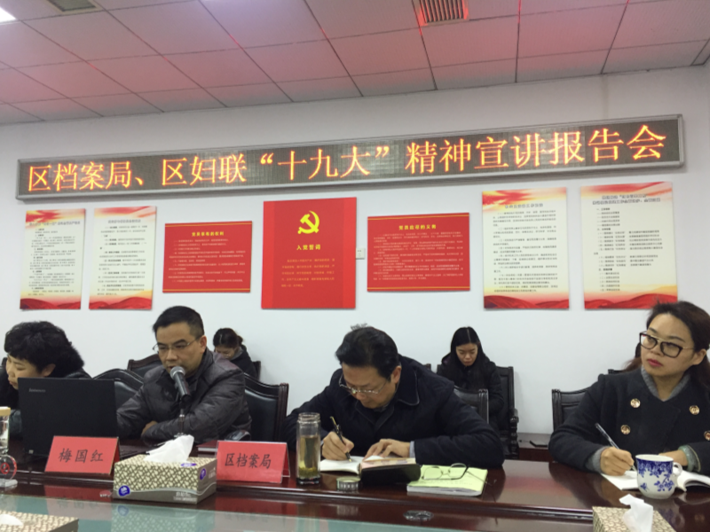 为深入学习宣传贯彻党的十九大精神,把全局广大干部职工的思想统一到党的十九大精神上来,把力量凝聚到党的十九大确定的各项任务上来,12月14日下午,江汉区档案局、江汉区妇联联合在区档案局举办党的十九大精神宣讲报告会,邀请区委宣讲团成员、区委宣传部副部长、区媒体传播发展中心主任梅国红同志作了题为“夺取新时代中国特色社会主义伟大胜利的行动纲领”专题报告。区档案局、区妇联党组成员及全体党员干部20余人聆听了报告。
