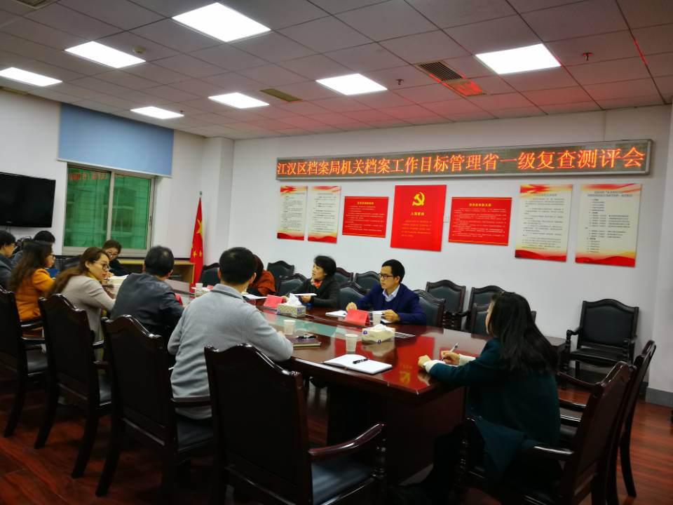 11月13日下午,由市档案局业务指导处吴涛副处长带队的评审组到江汉区档案局进行了机关档案工作目标管理省一级的复查测评,江汉区档案局以总分88分(省一级标准的最高分为89.5分)顺利通过了此次复查。