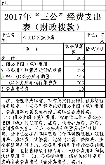 (四)预算绩效管理工作开展情况。2017年度,武汉市公安局江汉区分局对三个项目需要重点预算绩效评价,涉及一般公共预算当年财政拨款1196万元。