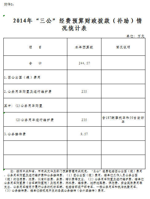 2014年部门财政拨款资金安排“三公”经费预算244.57万元。具体情况如下: