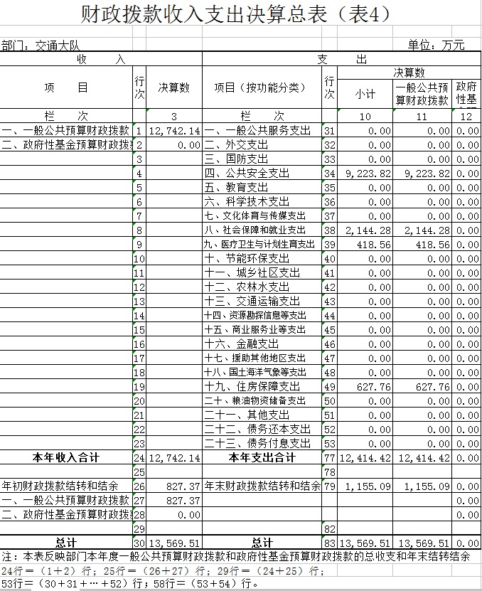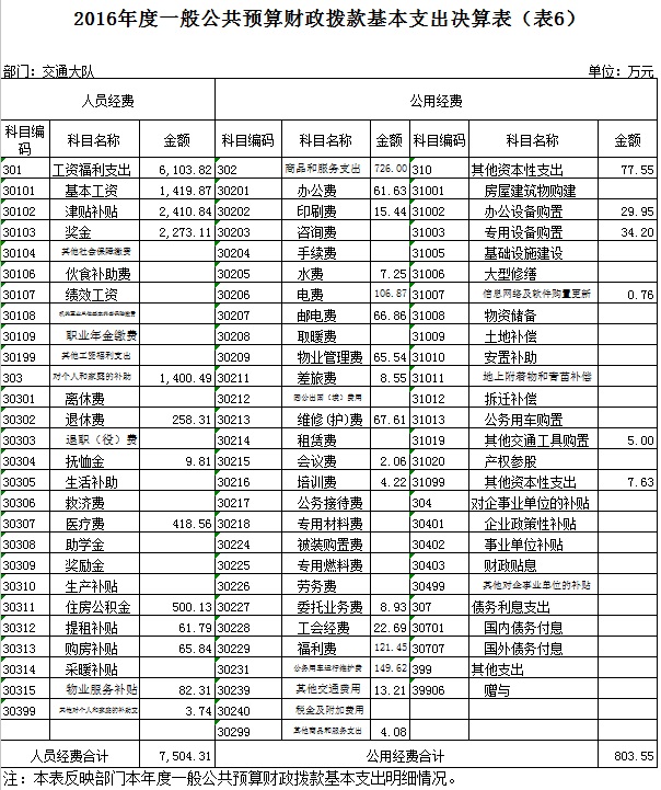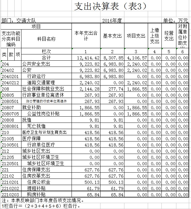 2016年一般公共预算财政拨款支出年度预算13569.51万元(包括年初部门预算、基本建设等专项资金、上级下达的专项转移支付资金及年初结转和结余资金等支出),支出决算为12414.42万元,完成年度预算的91.49%。其中:基本支出8307.85万元,项目支出4106.57万元。项目支出主要用于执法办案业务费163.85万元;维稳工作经费28.19万元;宣传费20万元;事故鉴定费62.31万元;罚没停车费77.72万元;事故、违章专用文书32.63万元;执勤补贴63.15万元;加班补贴173.76万元;临时用工人员经费32.36万元;执勤办案费(污染费)154.16万元;协警工作经费265.56万元;设备维护消耗经费49.28万元;违法违章车辆停车费240万元;协管员经费1866.55万元;警务通设备购置58.98万元;执法摄像器材1.14万元;设备更新17.41万元;摩托车购置经费127.81万元;信号灯、设备电费24万元等。其主要成效在于提高我辖区安全通行效益,为人民群众出行、为经济建设和社会发展创造良好的道路交通环境,预防和减少了道路交通事故的发生,保护人民群众生命、财产安全。