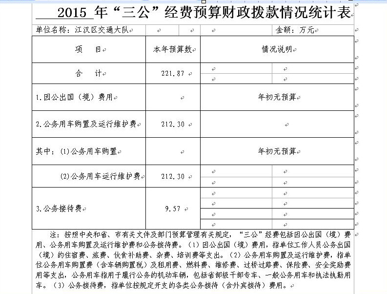 2015年江汉区交通大队“三公”经费预算财政拨款情况统计表