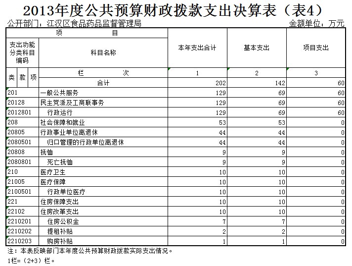 武汉市江汉区工商业联合会2013年公共预算财政拨款支出年度预算为202万元,支出决算为202万元,完成年度预算的100%。其中:基本支出 142万元,主要是:行政运行69万元(在职人员工资和办公经费)、退休人员支出44万元、抚恤9万元、医疗保障10万元、住房改革10万元;项目支出60万元。项目经费支出情况如下: