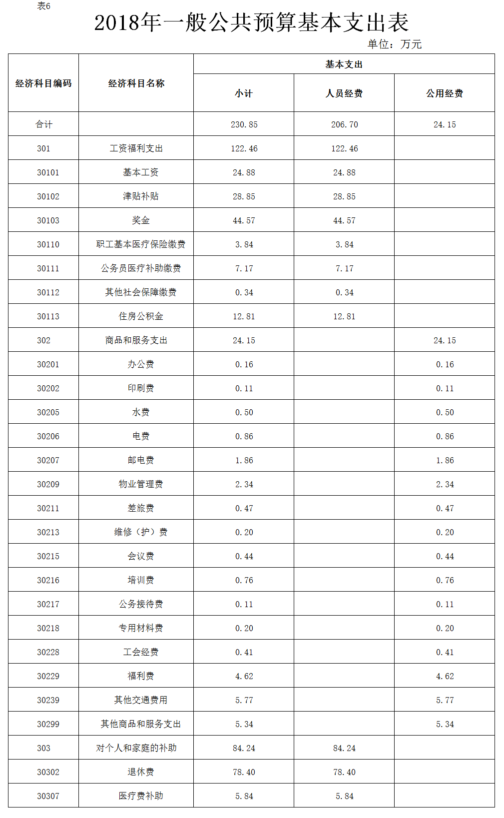 (一)基本支出 230.85万元,较2017年年初预算增加15.56 万元,增长 7 %,主要原因是:人员工资正常晋级晋档、退休人员分享支出和物价因素等。主要用于: