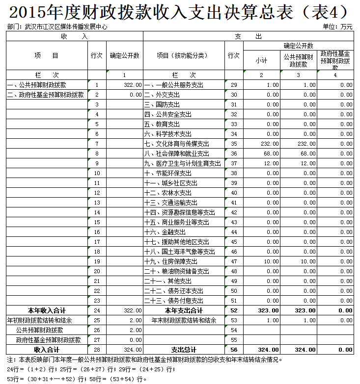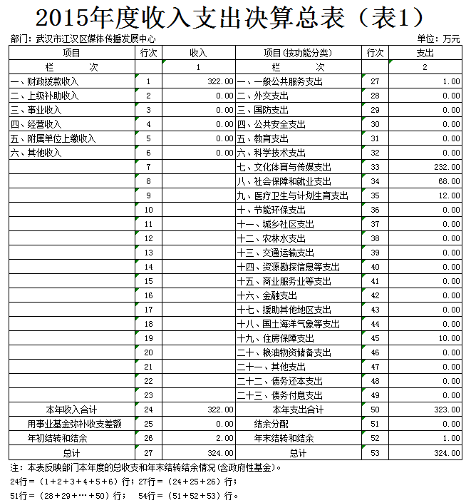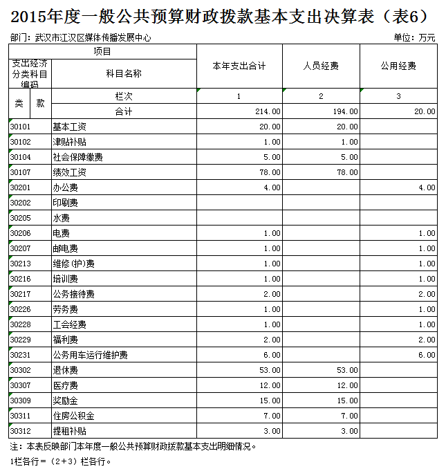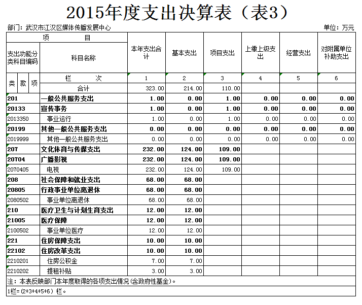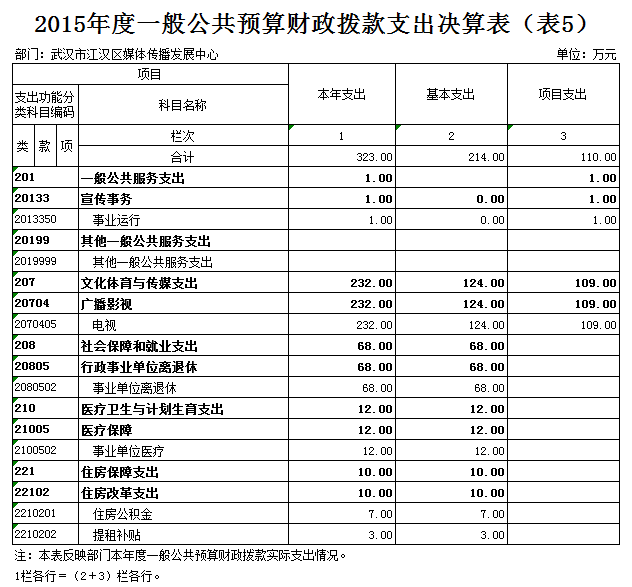 2015年一般公共预算财政拨款支出年度预算为324万元(包括年初部门预算、基本建设等专项资金、上级下达的专项转移支付资金及年初结转和结余资金等支出),支出决算为323万元,完成年度预算的99%。其中:基本支出214万元,项目支出110万元。项目支出主要用于网络舆情80万元,主要成效对全区网络舆情工作负责指导协调,组织开展网络舆情信息收集、分析、研判和处置,跟踪了解和掌握网络舆情动态。负责互联网信息内容管理,统筹协调组织全区互联网宣传管理和舆论引导工作,维护互联网意识形态安全,处理网上有害信息,发布权威信息,组织开展网上评论工作。;新闻宣传30万元,主要成效承担江汉区广播电视节目和专题影像资料的采编制作,做好视听新型媒体的宣传工作,负责全区广播电视影像资料,音频,图片等资料的收集,留存,使用,保管;加强与各级电视台,电台,报社,网站等新闻媒体的沟通,交流,合作。通过对江汉区的正面的宣传报道凝心聚力,团结全区人民为“一区六中心”建设,打造“经济,城区,民生”三个升级做出贡献。