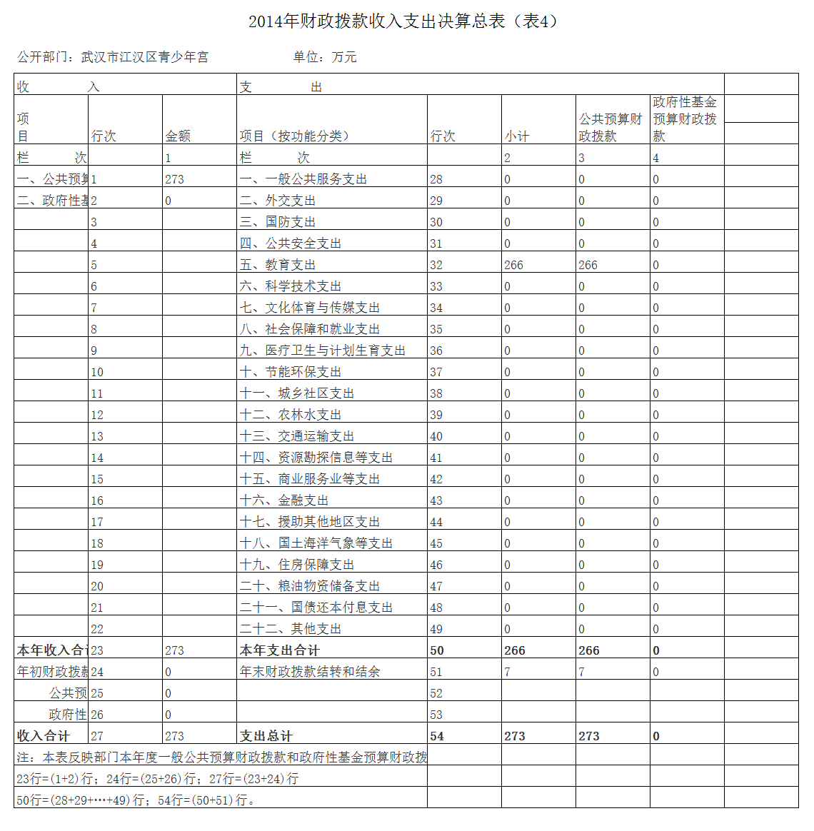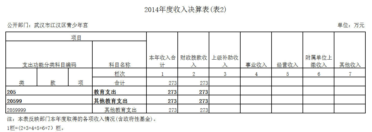 武汉市江汉区青少年宫2014年度本年收入合计273万元。其中:财政拨款收入(含政府性基金拨款) 273万元,占本年收入100%。