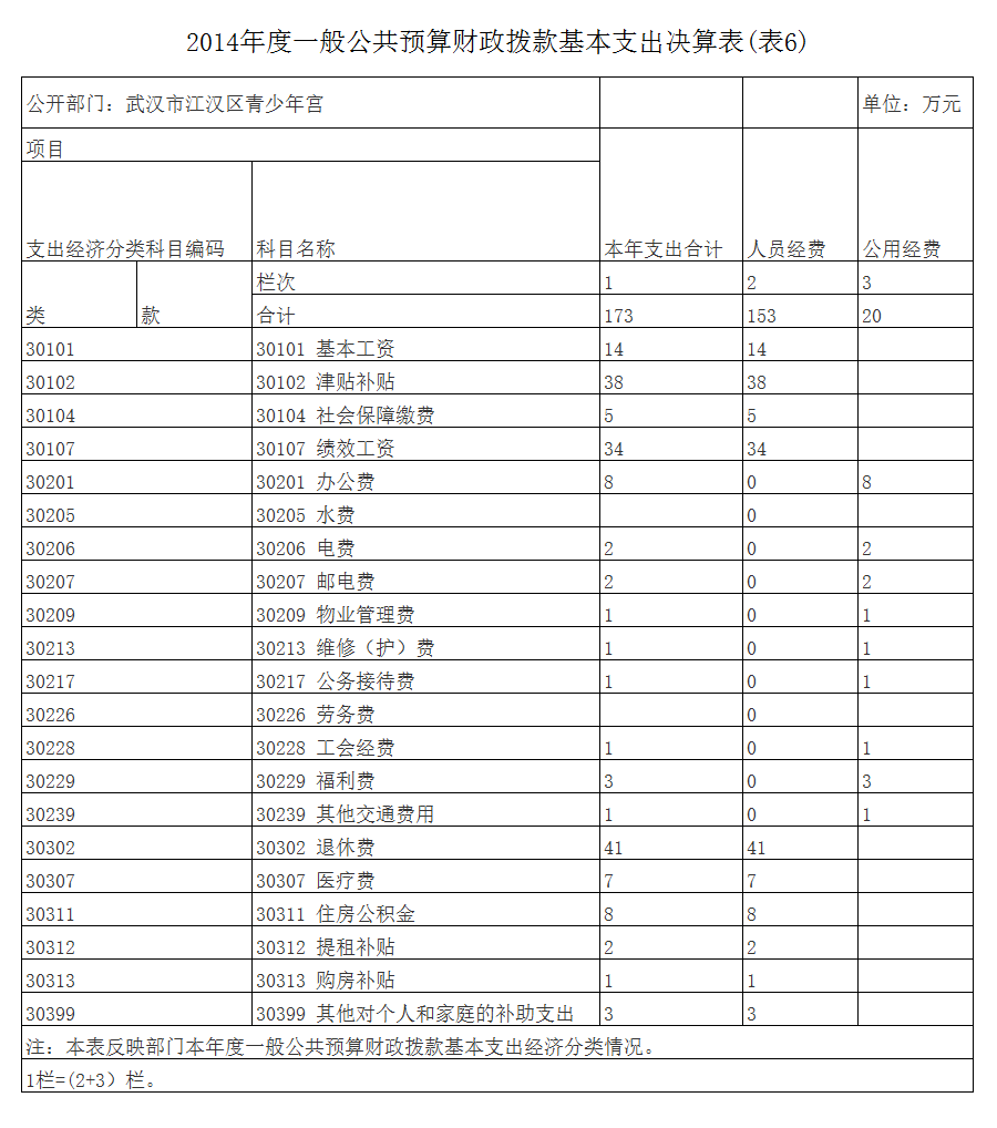 武汉市江汉区青少年宫2014度一般公共预算财政拨款基本支出173万元,其中,人员经费153万元,主要包括:基本工资、津贴补贴、奖金、社会保障缴费、伙食补助费、绩效工资、其他工资福利支出、离休费、退休费、抚恤金、退职(役)费、抚恤金、生活补助、医疗费、助学金、资励金、住房公积金、提租补贴、购房补贴、其他对个人和家庭的补助支出;公用经费20万元,主要包括:办公费、印刷费、咨询费、手续费、水费、电费、邮电费、取暖费、物业管理费、差旅费、因公出国(境)费、专用维修(护)费、租赁费、会议费、培训费、公务接待费、专用材料费、被装购置费、专用燃料费、劳务费、委托业务费、工会经费、福利费、公务用车运行维护费、其他交通费用、税金及附加费用、其他商品和服务支出、办公设备购置、专用设备购置、信息网络及软件购置更新、其他资本性支出。