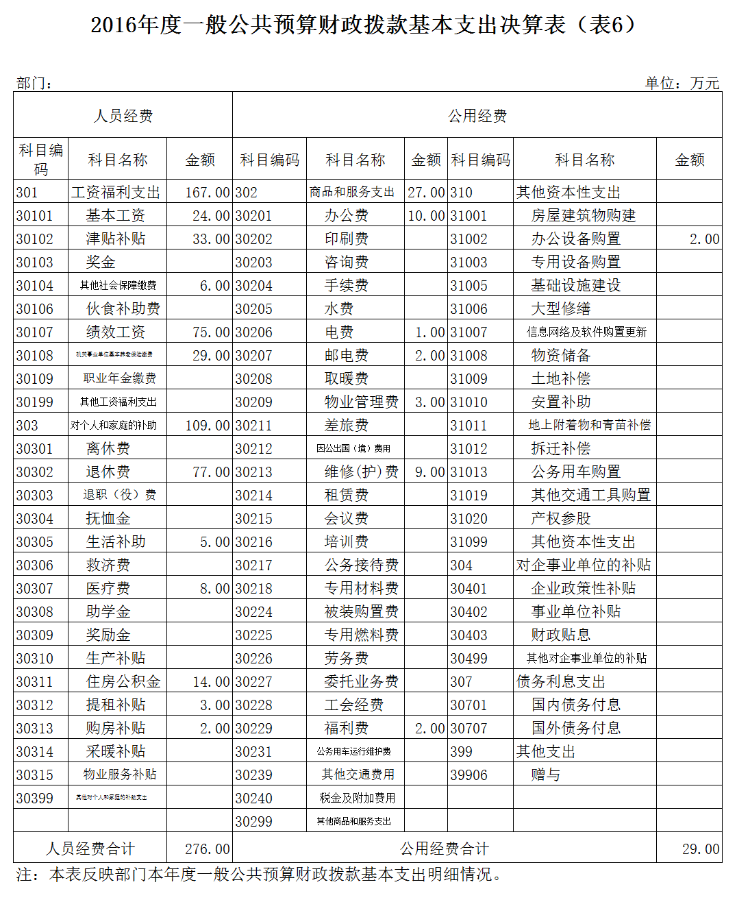 2016年度一般公共预算财政拨款基本支出305万元,其中,人员经费276万元,主要包括:基本工资、津贴补贴、奖金、社会保障缴费、绩效工资、其他工资福利支出、离休费、退休费、抚恤金、退职(役)费、抚恤金、生活补助、救济费、医疗费、助学金、奖励金、生产补贴、住房公积金、提租补贴、购房补贴、其他对个人和家庭的补助支出;公用经费27万元,主要包括:办公费、印刷费、咨询费、手续费、水费、电费、邮电费、取暖费、物业管理费、差旅费、因公出国(境)费、维修(护)费、租赁费、会议费、培训费、公务接待费、专用材料费、被装购置费、专用燃料费、劳务费、委托业务费、工会经费、福利费、公务用车运行维护费、其他交通费用、税金及附加费用、其他商品和服务支出;其他资本性支出2万元,主要包括:房屋建筑构建费、办公设备购置、专用设备购置、基础设施建设、大型修缮、信息网络及软件购置更新、物资储备、土地补偿、安置补助、地上附着物和青苗补助、拆迁补偿、公务用车购置、其他交通工具购置、其他基本建设和资本性支出。