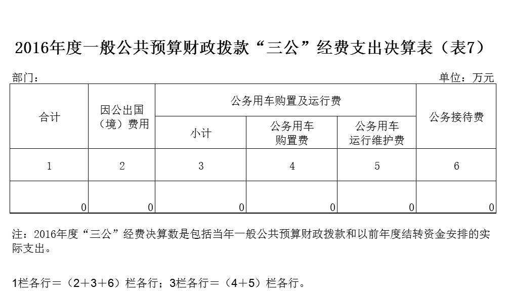 2016年度“三公”经费财政拨款支出决算数与2015年持平,无增减变化,其中, 因公出国(境)费用支出决算为0万元,与年初预算持平,无增减变化。公务用车购置及运行维护费支出决算为0万元,全年未使用年初预算1.2万元,主要原因是加强管理、厉行节约。公务接待费支出决算为0万元,全年未使用年初预算1.7万元,减少的主要原因是按照中央八项规定的要求,压缩了公务接待的开支,加强管理、厉行节约。