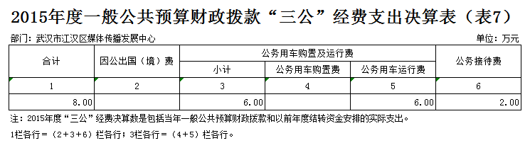 2015年度“三公”经费财政拨款年度预算为8万元,支出决算为8万元,完成预算的100%。其中: