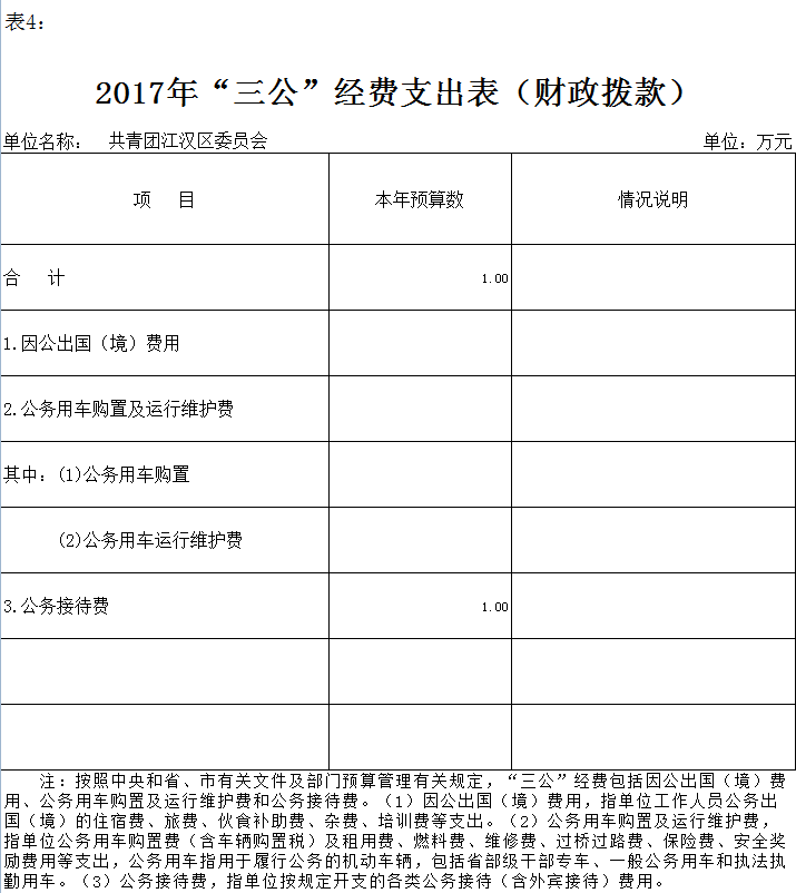 共青团武汉市江汉区委员会因公出国(境)费、公务接待费、公务用车购置及运行维护费。