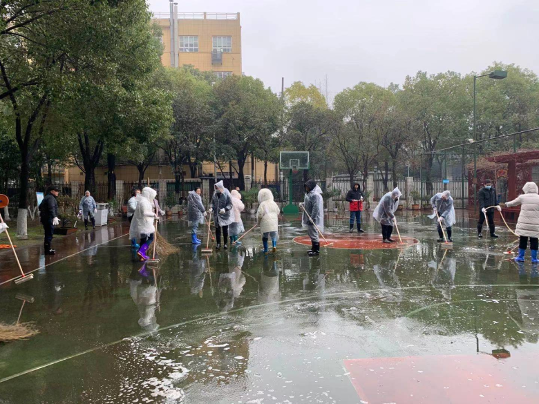 早上9点,在校长张惠君的带领下,党校全体工作人员家分别拿上竹扫把、刷子,穿上雨衣、雨鞋,戴上手套在篮球场集合。