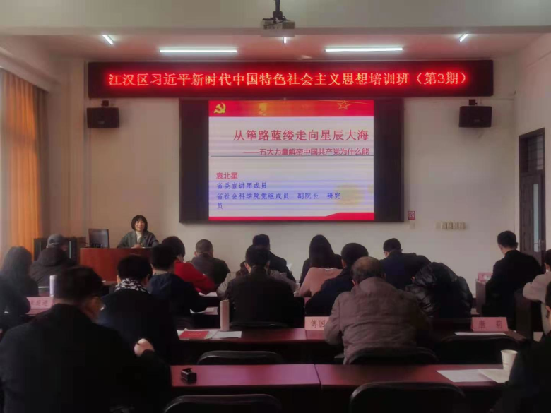 会后,区委党校组织全体党员干部参加由省委宣讲团成员、省社科院党组成员、副院长、研究员袁北星的《从筚路蓝缕走向星辰大海——五大力量解密中国共产党为什么能》专题讲座。使广大党员干部更加深刻地认识我们党波澜壮阔的发展历程,更加坚定理想信念,不断增强“四个意识”、坚定“四个自信”、做到“两个维护”。为勇当国家中心城市“五个中心”建设排头兵,建设富裕活力美丽幸福的现代化新江汉不断奋斗。(涂丹)